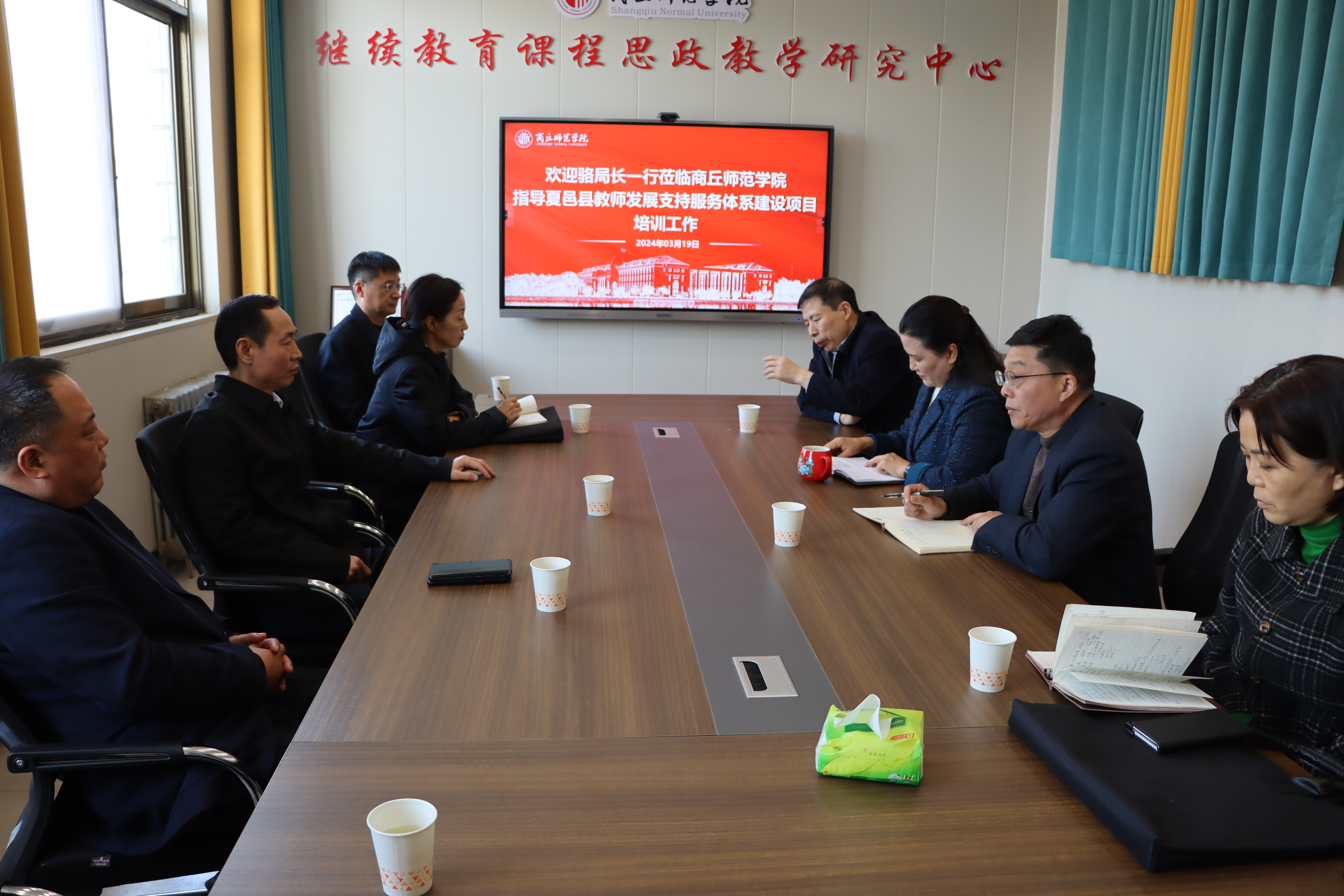 2024年3月19日,夏邑县教体局局长骆松枫、副局长董敏,师训股股长李峰、教师进修学校董事长胡春亮一行四人到bv伟德国际1946观摩和指导夏邑县县域教师发展支持服务体系建设项目—骨干董事长、教师培训团队培训工作。bv伟德国际1946副董事长张箭,公司党总支书记牛月翰,经理李玲、副经理司彩玲,项目顾问专家王启明等项目组成员与骆松枫一行就项目实施及夏邑县教师培训工作进行了深入细致的座谈和交流。