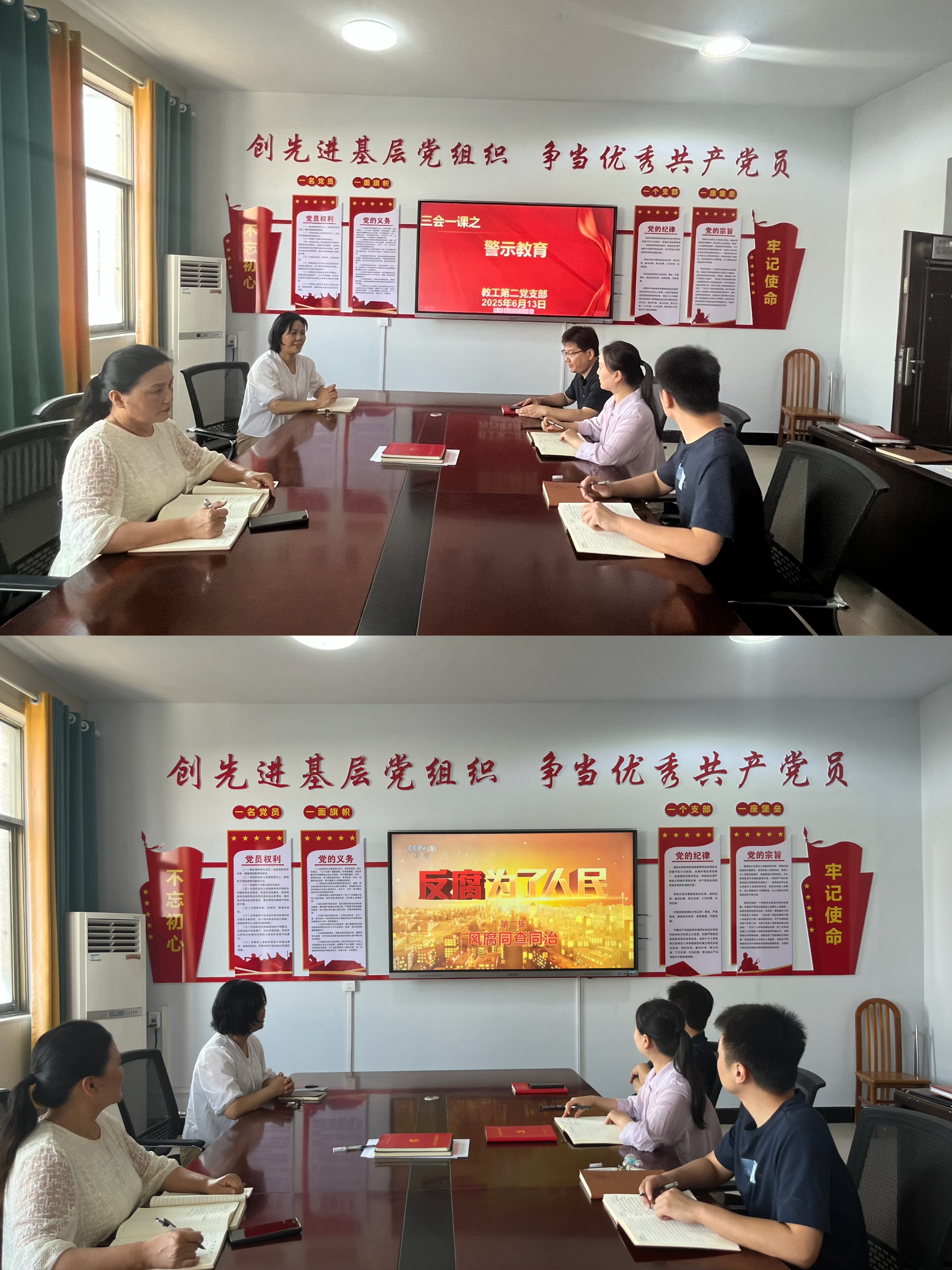 为持续深化中央八项规定精神学习教育成效,进一步严明纪律规矩,强化警示震慑,6月13日下午,教工第二党支部组织党员干部开展“三会一课”之警示教育,支部全体党员参加。