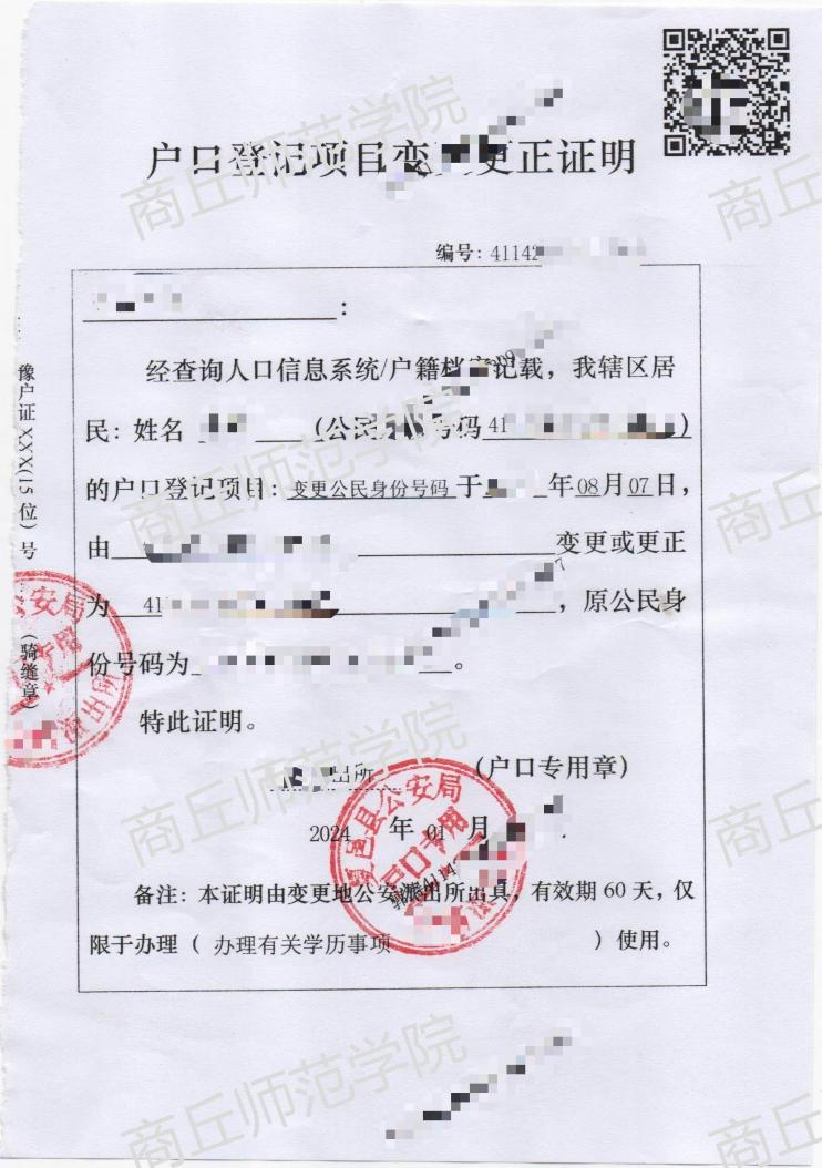 ③派出所出具的相关身份证信息变更证明(注意:户口登记项目日期,需在专科毕业后至本科报考前,有二维码和骑缝章,否则属于日期套叠,不予受理);